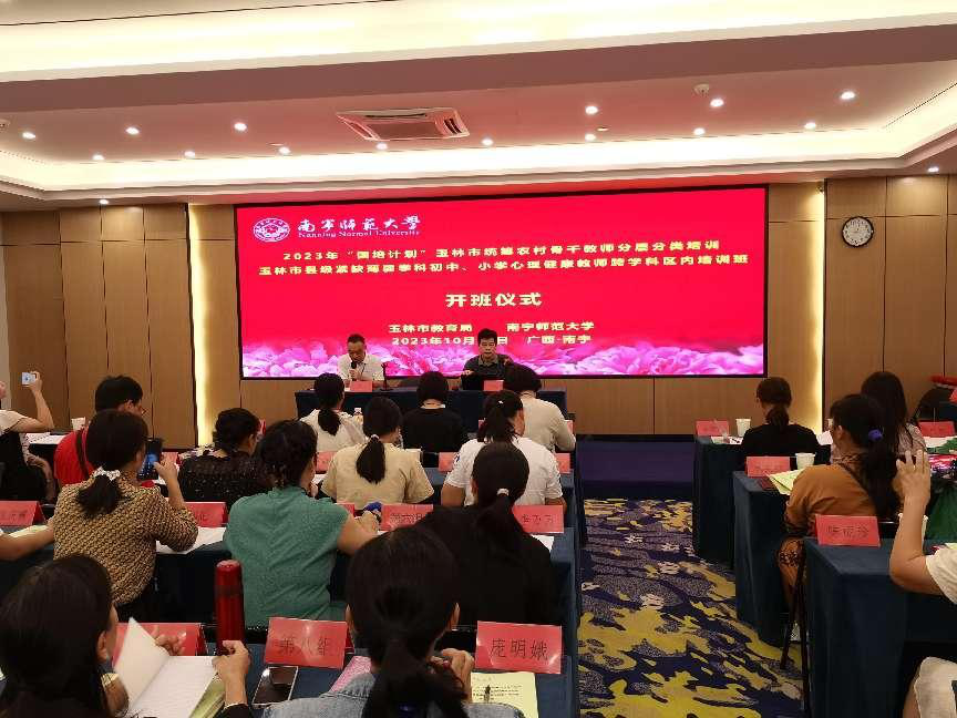 10月18日下午,由玉林市教育局主办、南宁师范大学承办的2023年“国培计划”玉林市统筹项目——农村骨干教师分层分类培训——玉林市县级紧缺薄弱学科初中、小学心理健康教师跨学科区内培训项目在南宁顺利开班,来自玉林市60名县级初中、小学心理健康教师出席了开班仪式。