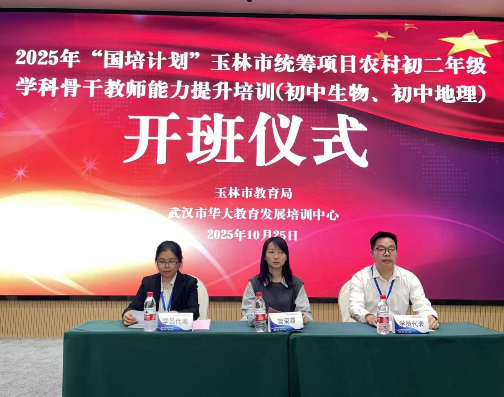 2025年10月25日上午,由玉林市教育局主办,武汉市华大教育发展培训中心承办的2025年“国培计划”玉林市统筹项目——农村初二年级学科骨干教师能力提升培训班(生物、地理)在南宁市顺利开班。武汉市华大教育发展培训中心项目负责人曾菊霞、教学班主任及来自玉林市各县市区的120名初二年级生物和地理学科骨干教师共同参加开班仪式。