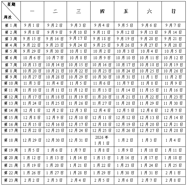 1.2025年秋季学期:义务教育一至八年级于2025年8月31日开学(报到、注册),9月1日正式上课,于2026年1月30日放寒假;九年级于2025年8月24日开学(报到、注册),8月25日正式上课,于2026年1月30日放寒假;高一、高二年级于2025年8月24日开学(报到、注册、缴费),8月25日正式上课,于2026年1月30日放寒假;高三年级于2025年8月3日开学(报到、注册、缴费),8月4日正式上课,于2026年2月6日放寒假。