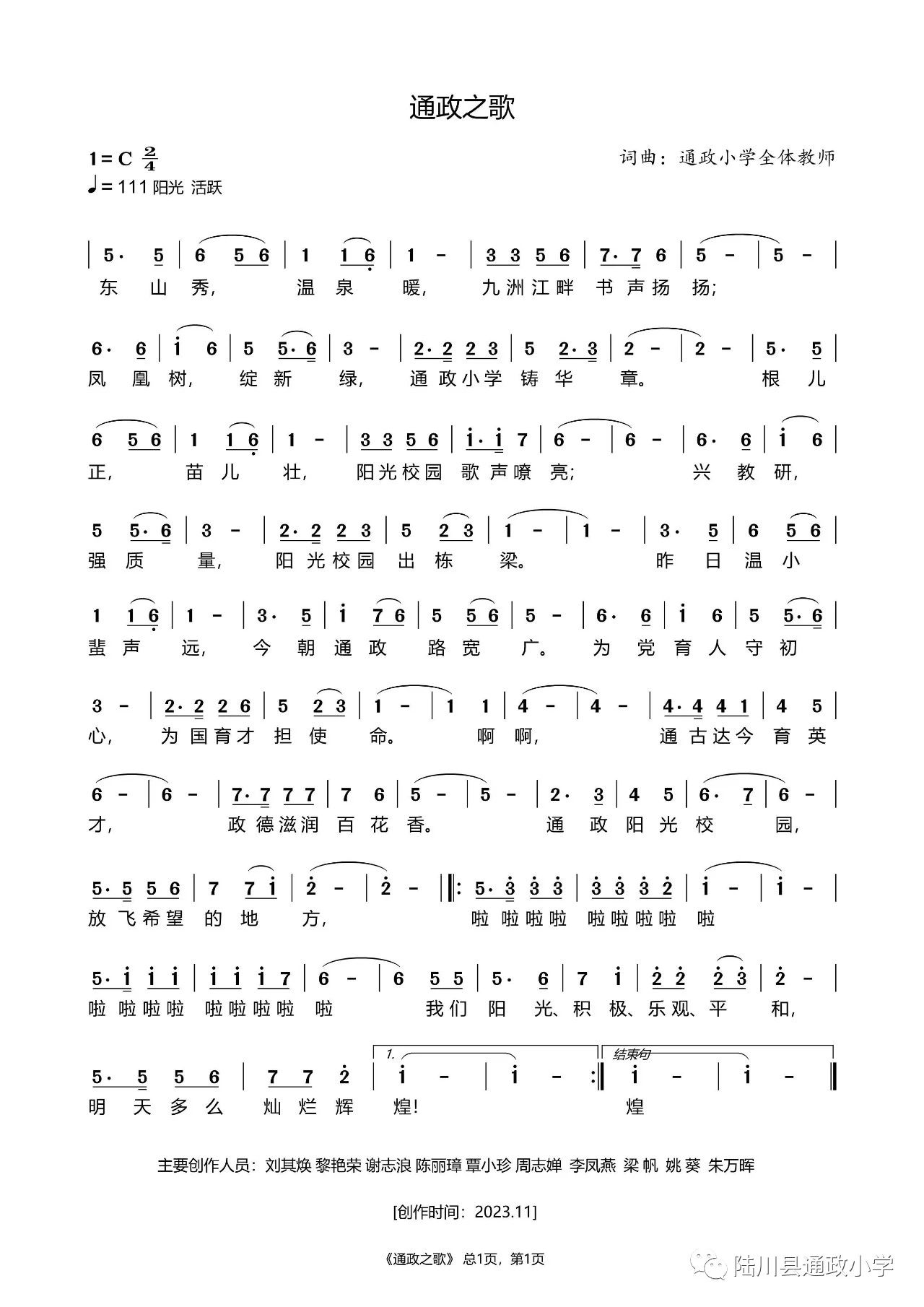 这首校歌由通政小学全体师生共同作词,陆川县青少年活动中心黎艳荣副主任作曲代表着学校的精神风貌和学子们的成长历程,将成为学校的精神符号和凝聚力量的象征。